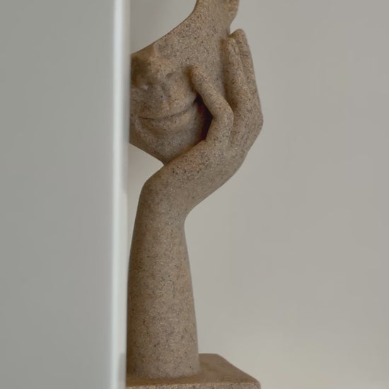Escultura tallada en resina en tonos beige. La pieza Fragment representa la identidad. Escultura conceptual y minimalista que eleva una repisa o mesa de centro.