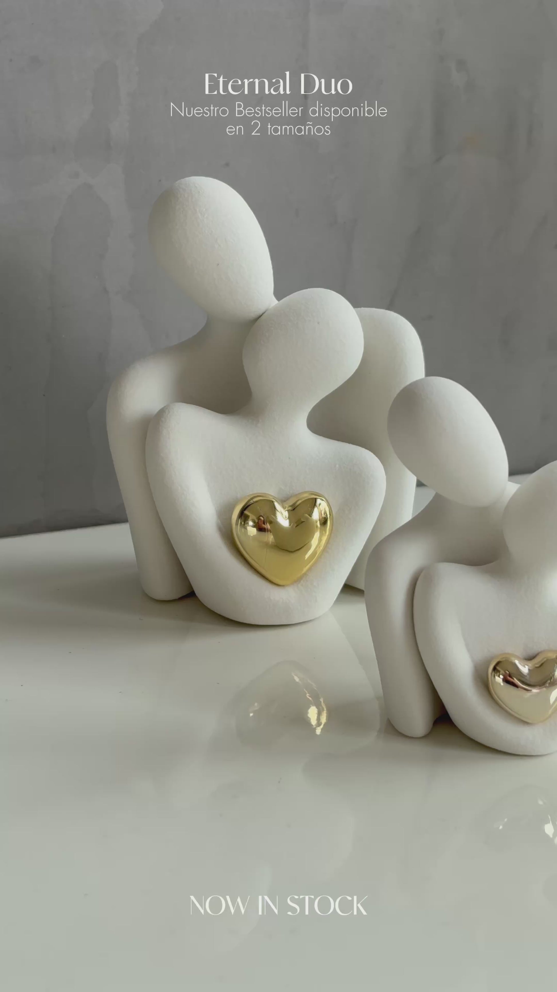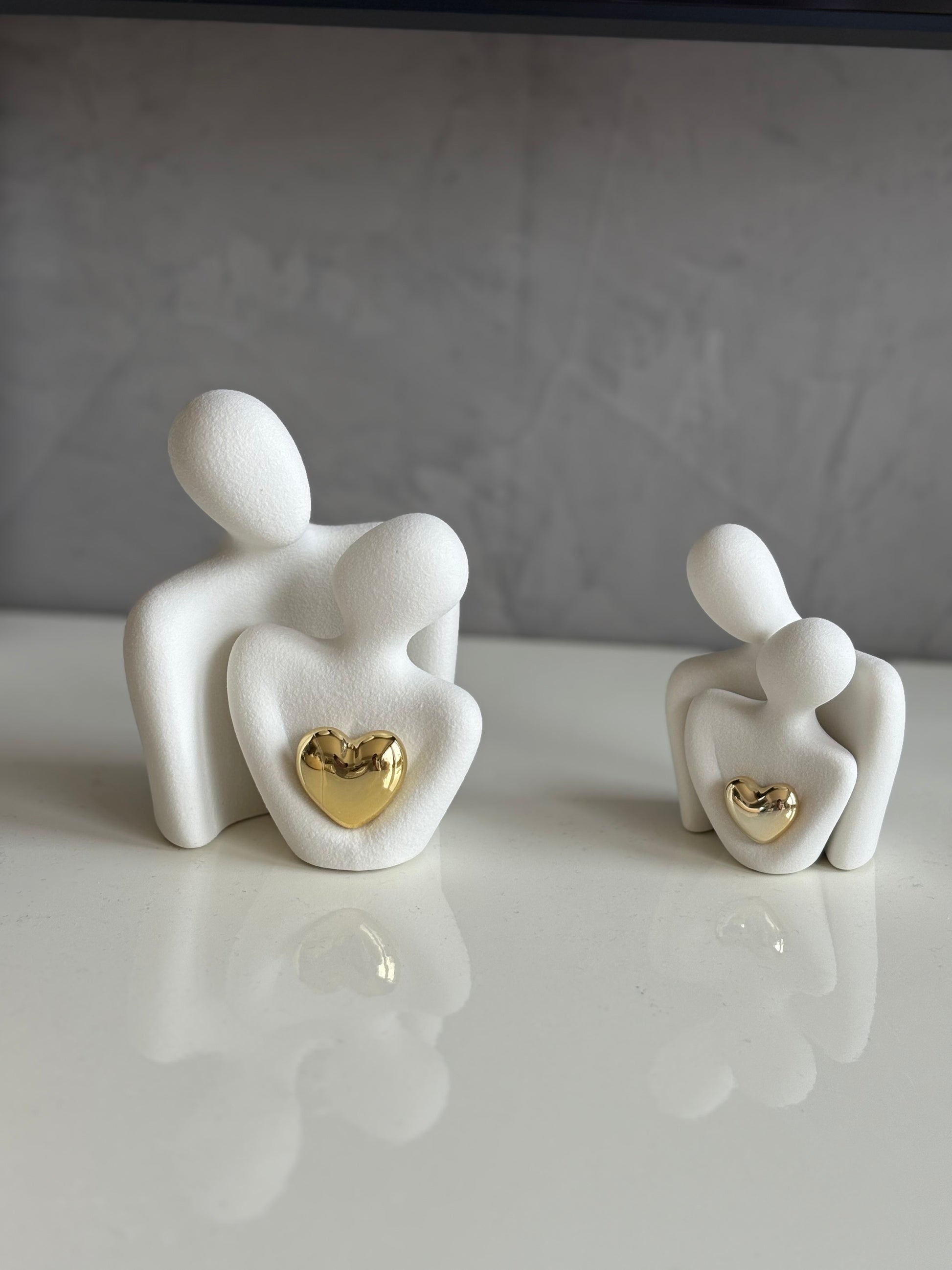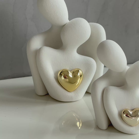 Escultura de cerámica de dos piezas con corazón dorado. Elegante y minimalista. Representa la unión de dos almas. Disponible en 2 tamaños.
