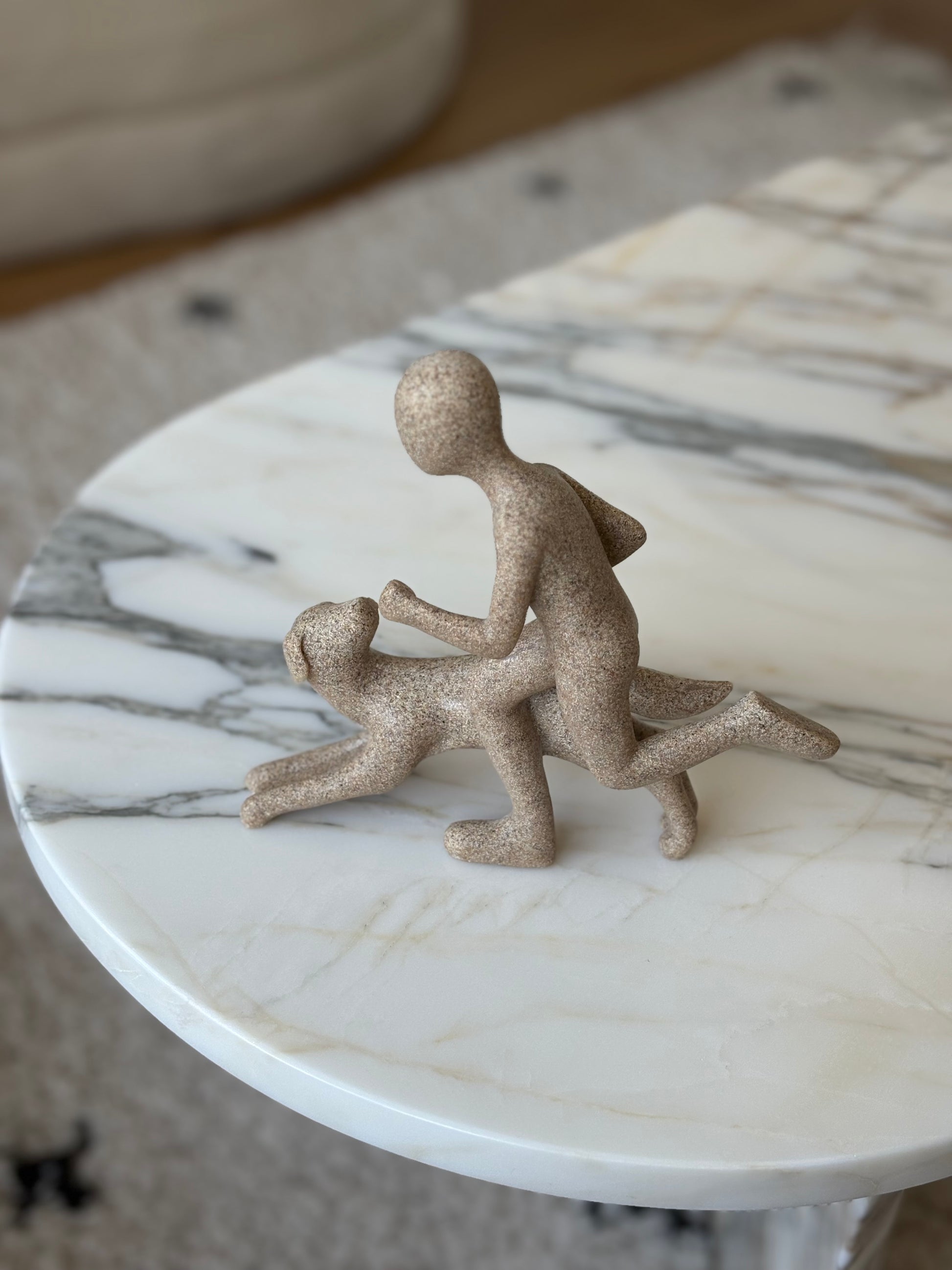 Escultura de hombre y perro corriendo tallada en resina. Esta pieza representa captura la esencia del amor más puro: la amistad sincera y la lealtad condicional.