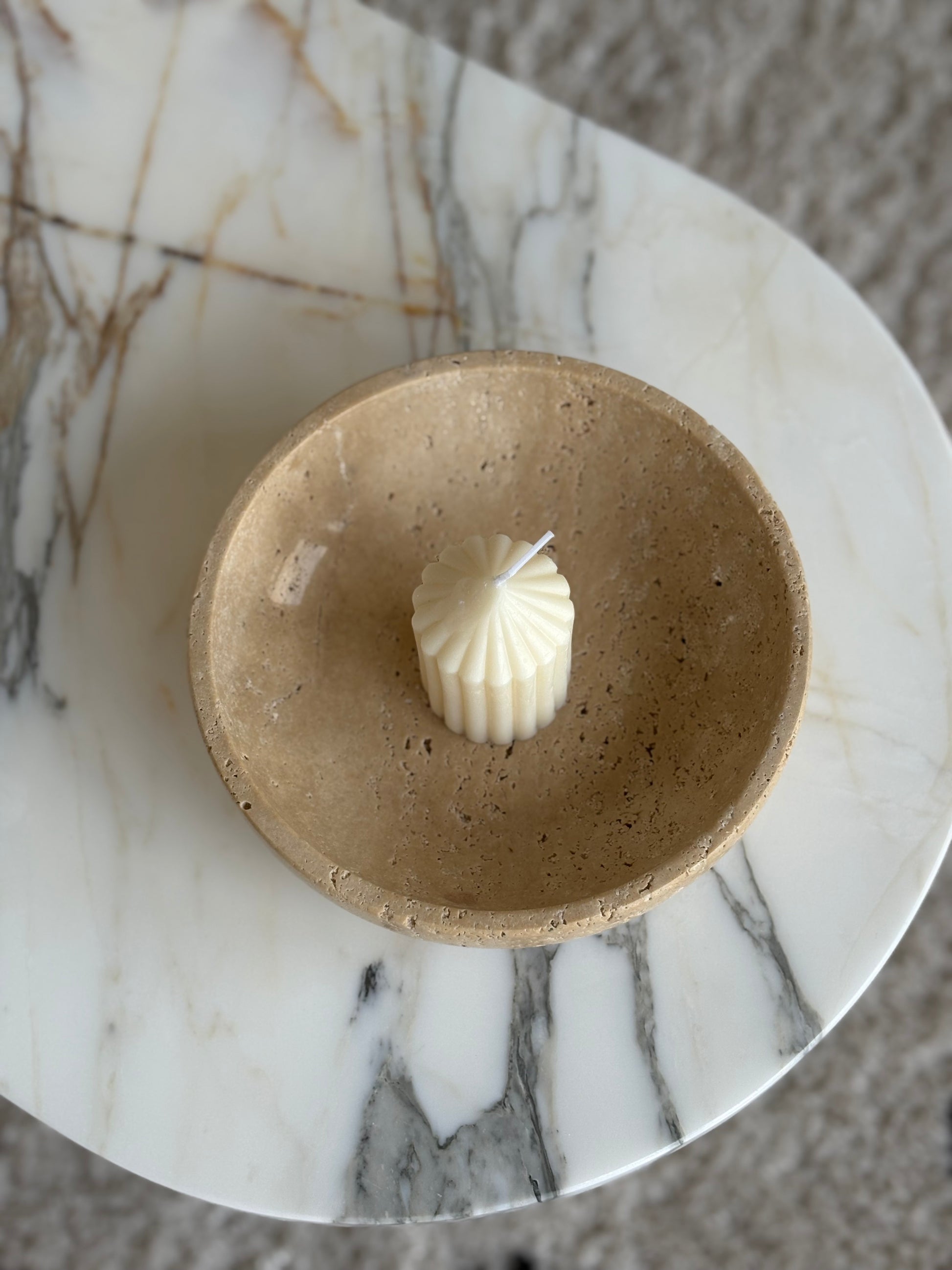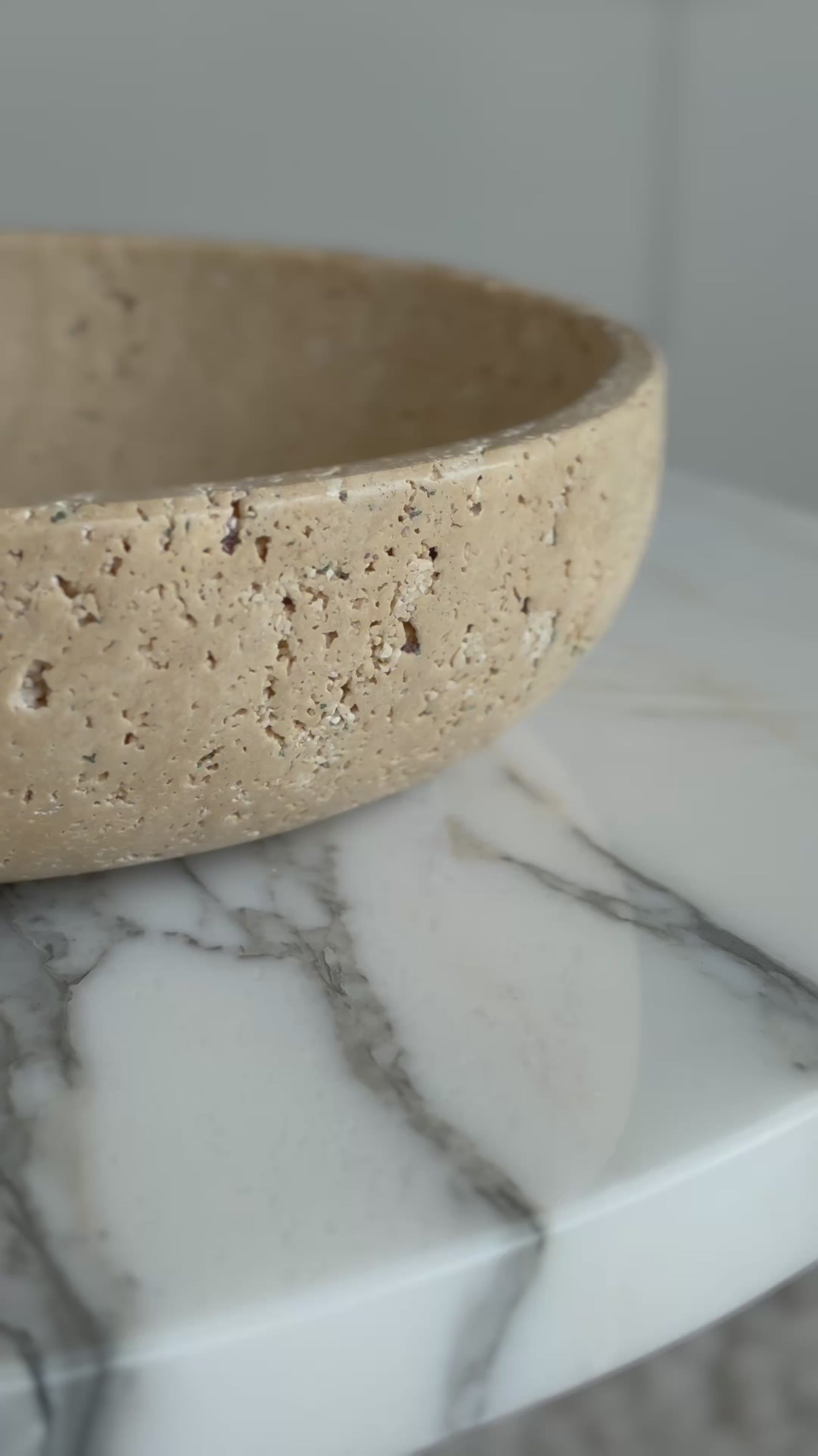 Fuente de Mármol Travertino tallada a mano color butterscotch. Textura natural. Práctica y versátil, ideal como centro de mesa, base para velitas, o baño de visitas.
