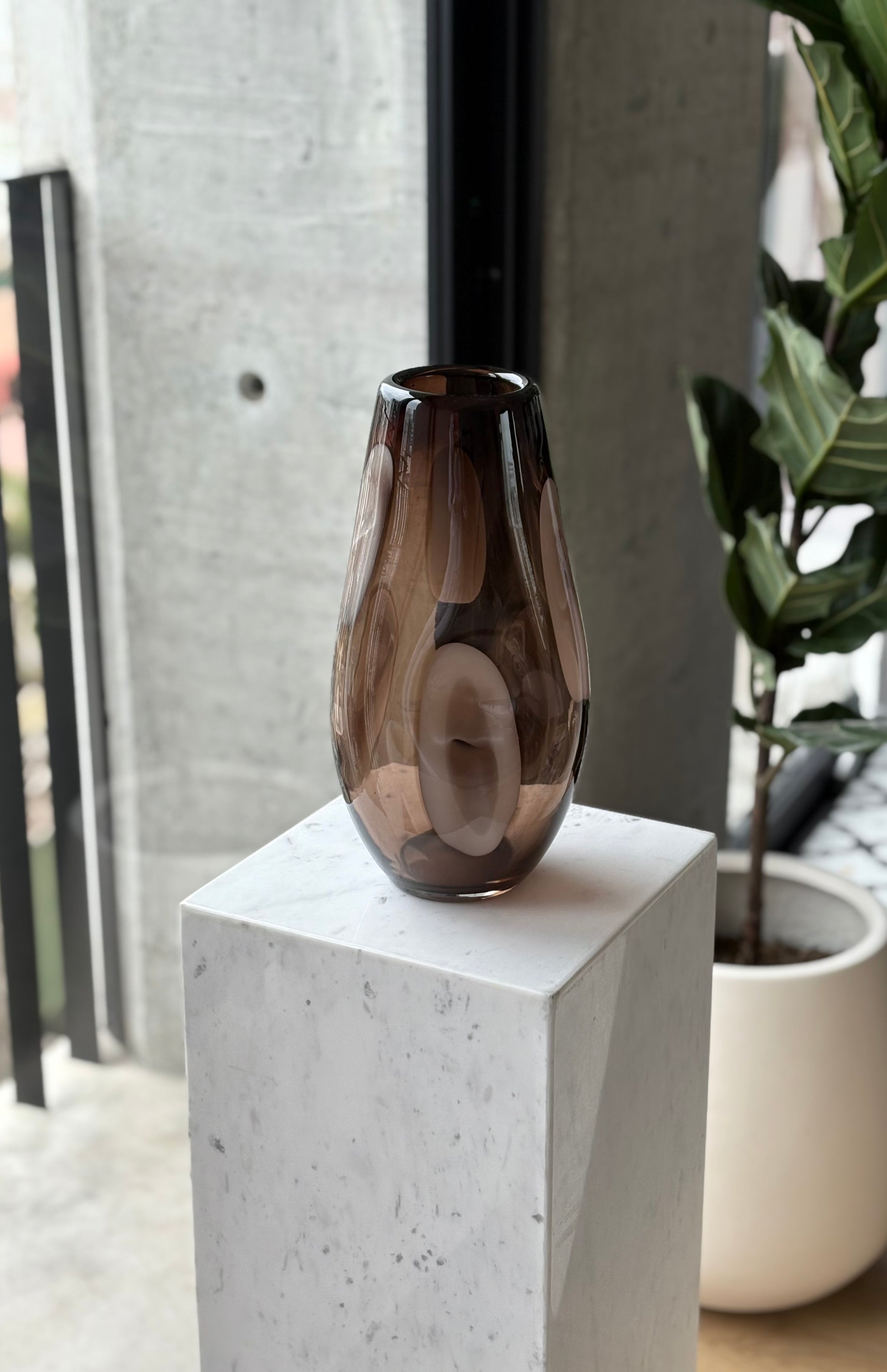 Jarrón de vidrio soplado en tonos marrones y beige.