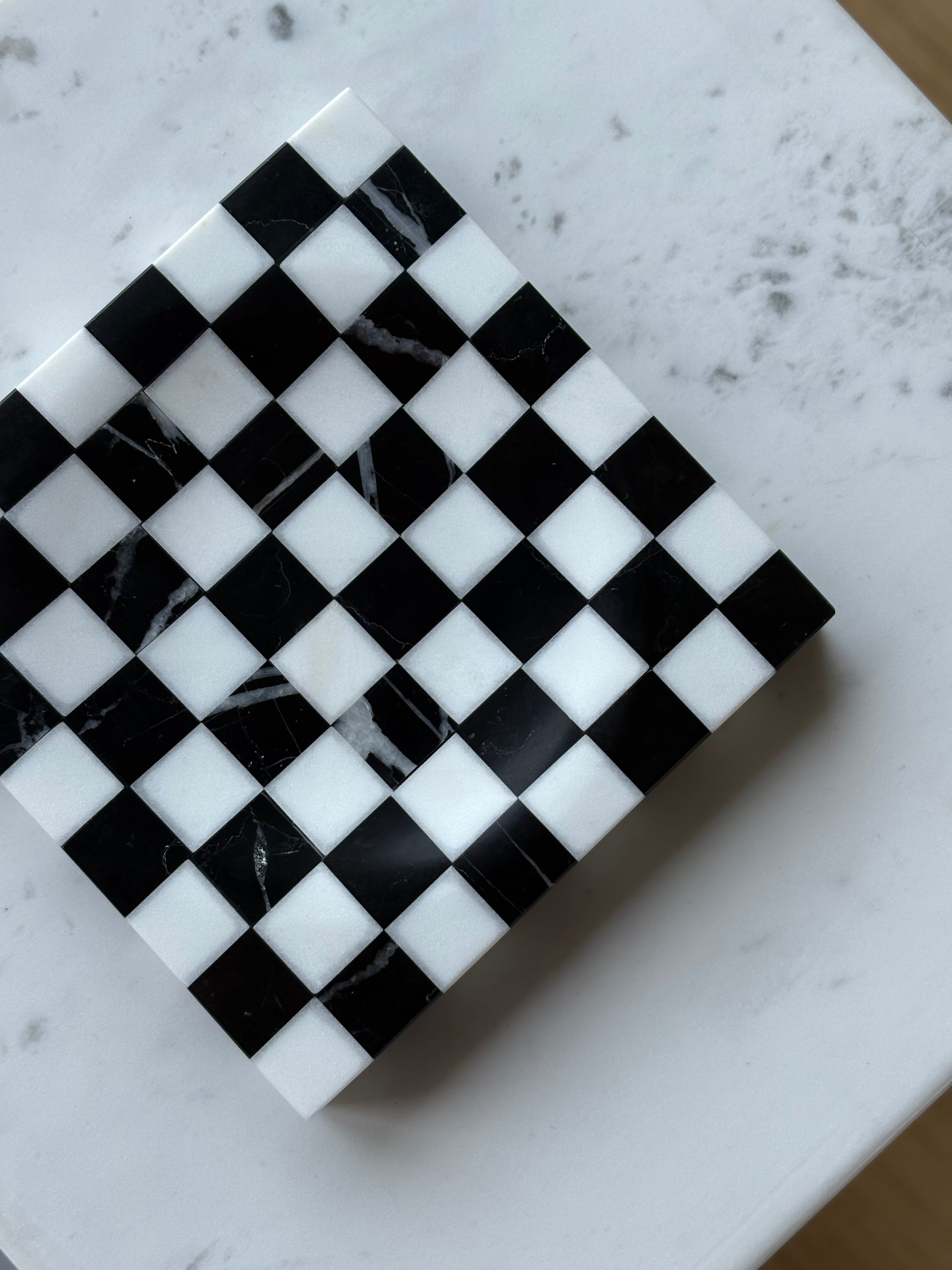 Joyero con patrón de cuadros tallado a mano en Mármol negro Español y Mármol blanco Griego. Diseño clásico y elegante que eleva cualquier tocador o mesa.