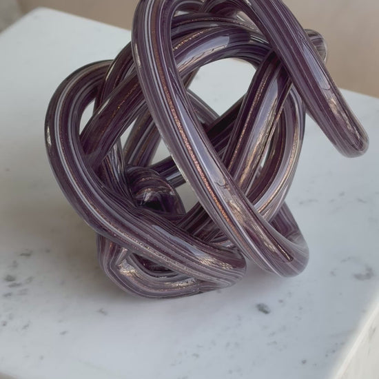 Escultura de nudo de vidrio color morado con acentos dorados